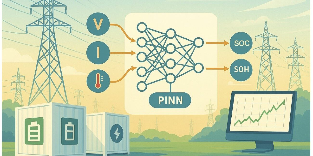 This capability is proving transformative for managing grid-connected battery storage systems. Here, PINNs integrate real world operational data with first principles electrochemical and thermal models. This synthesis allows them to generate physically consistent, trustworthy estimates and forecasts. They accurately infer critical states like State of Charge (SOC) and State of Health (SOH), track degradation trajectories, and act as the core for digital twins that monitor assets in real time. By translating forecasts for energy demand, renewable generation, and market prices into operational strategies, PINNs enable charge/discharge schedules that rigorously respect power, energy, and thermal constraints while explicitly accounting for battery aging.